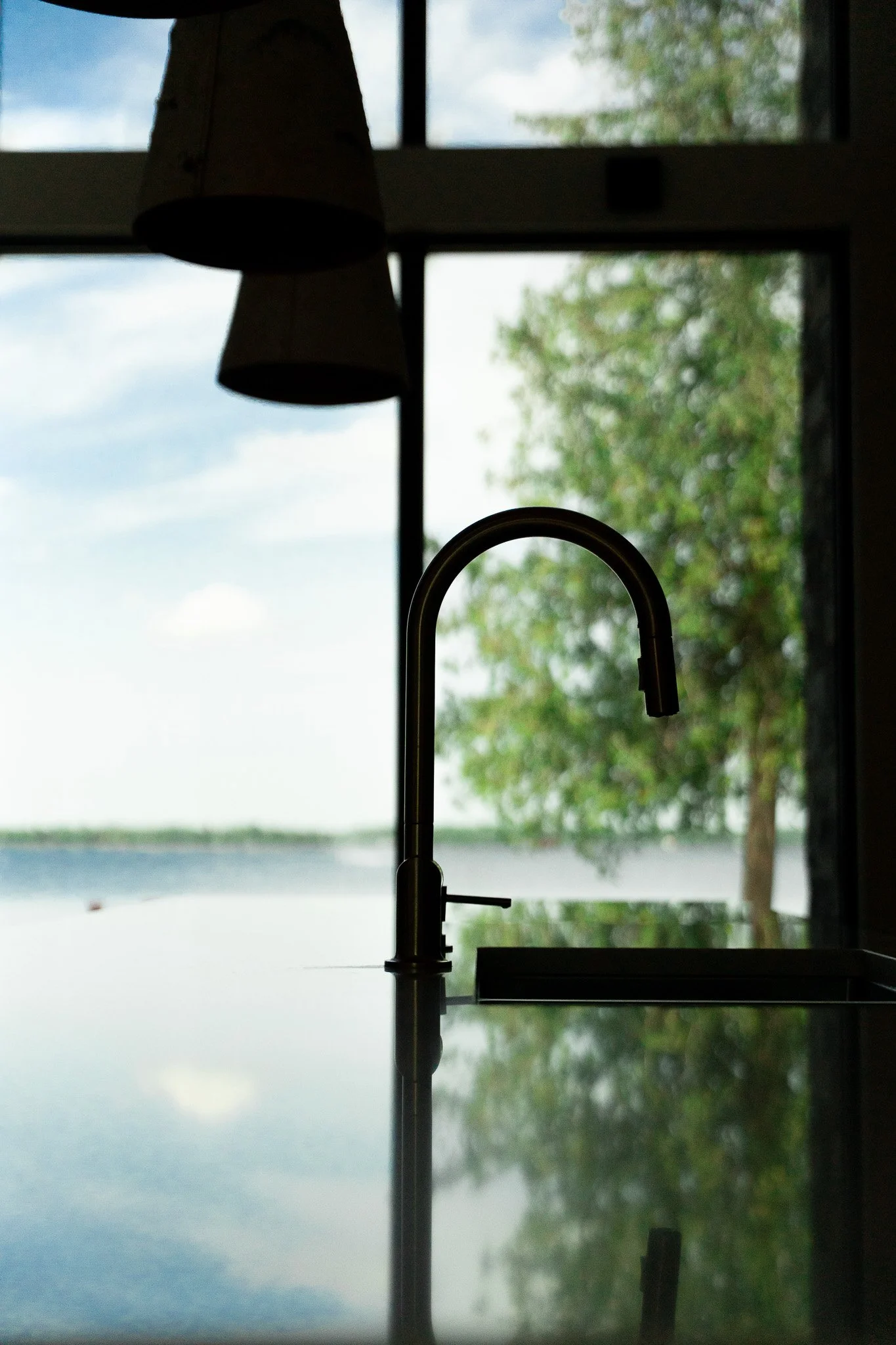 In the late afternoon, the trees and water mirror softly indoors, creating a quiet moment suspended in time.