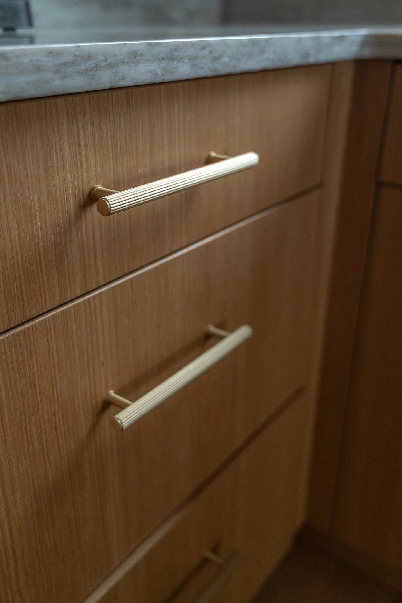 Light and shadow create calm for the eyeline through to this kitchen.