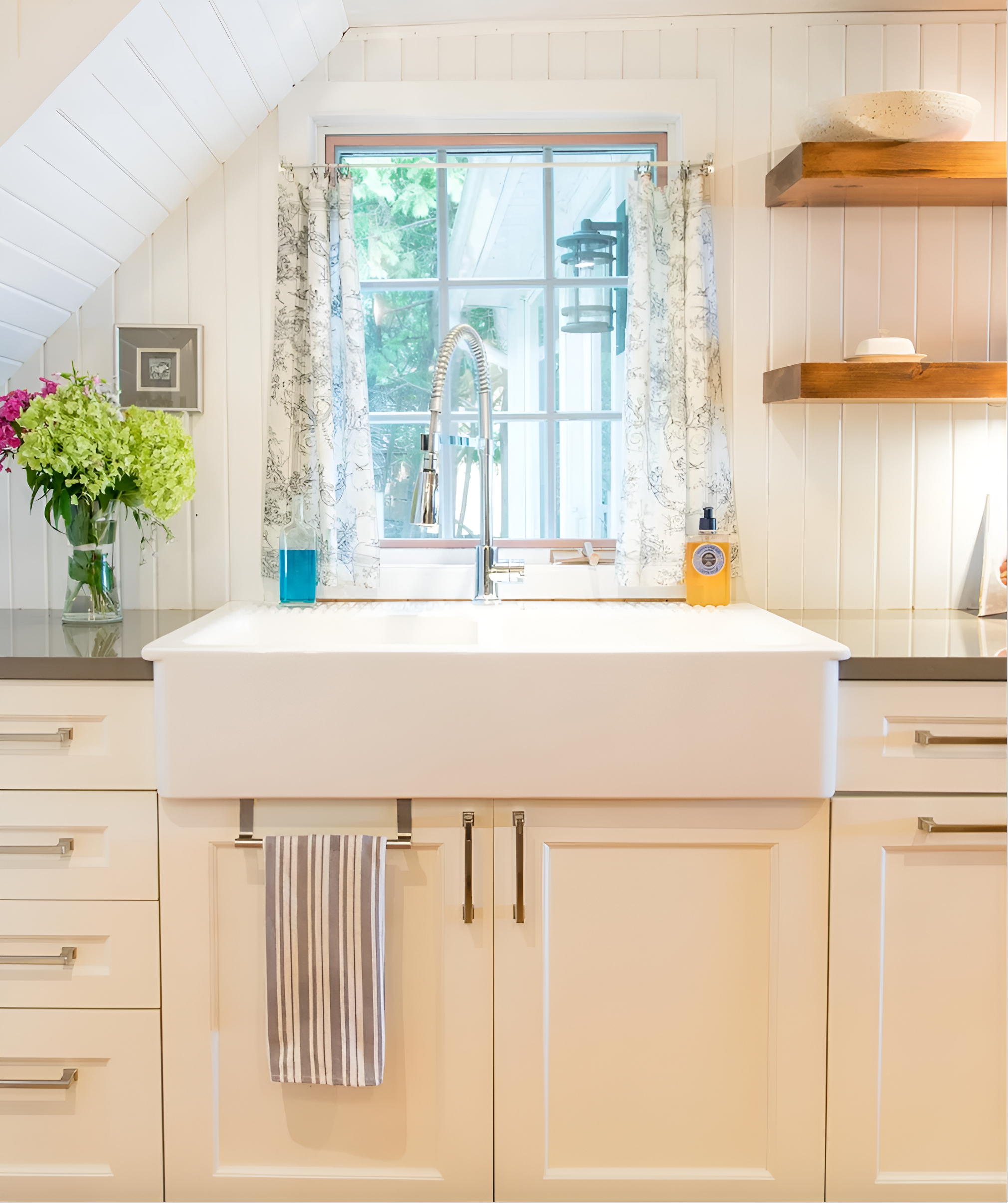 A country kitchen where everything has a place with a light palette delivers on high functionality in a small space.