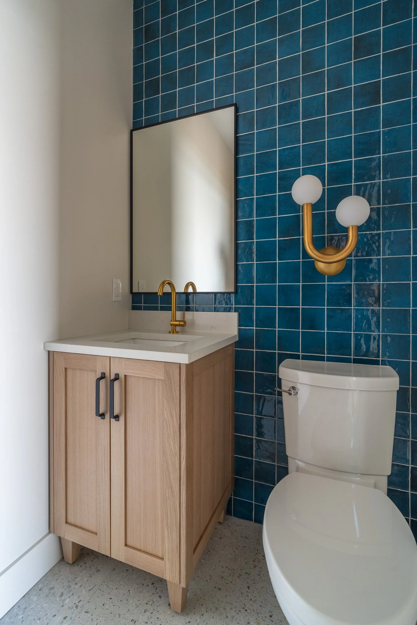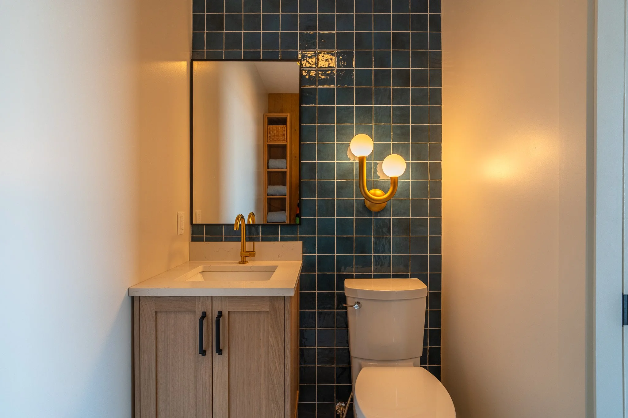 Soft ambient lighting in this powder room contrasts against the blue tile creating an even deeper shade of colour towards evening.