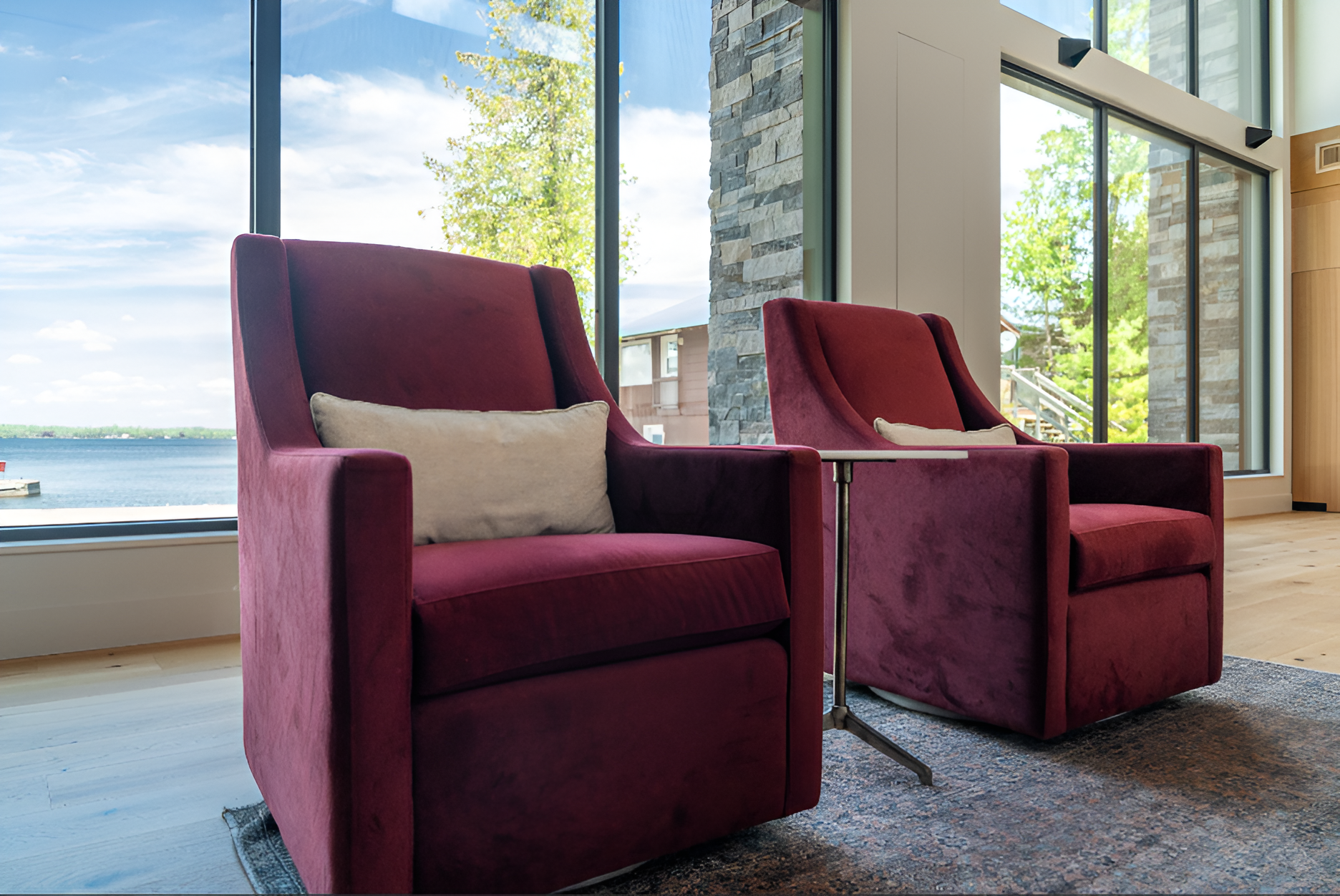 Matching accent chairs in a deep merlot add a hit of colour against the blue view of South Bay on Balsam Lake.