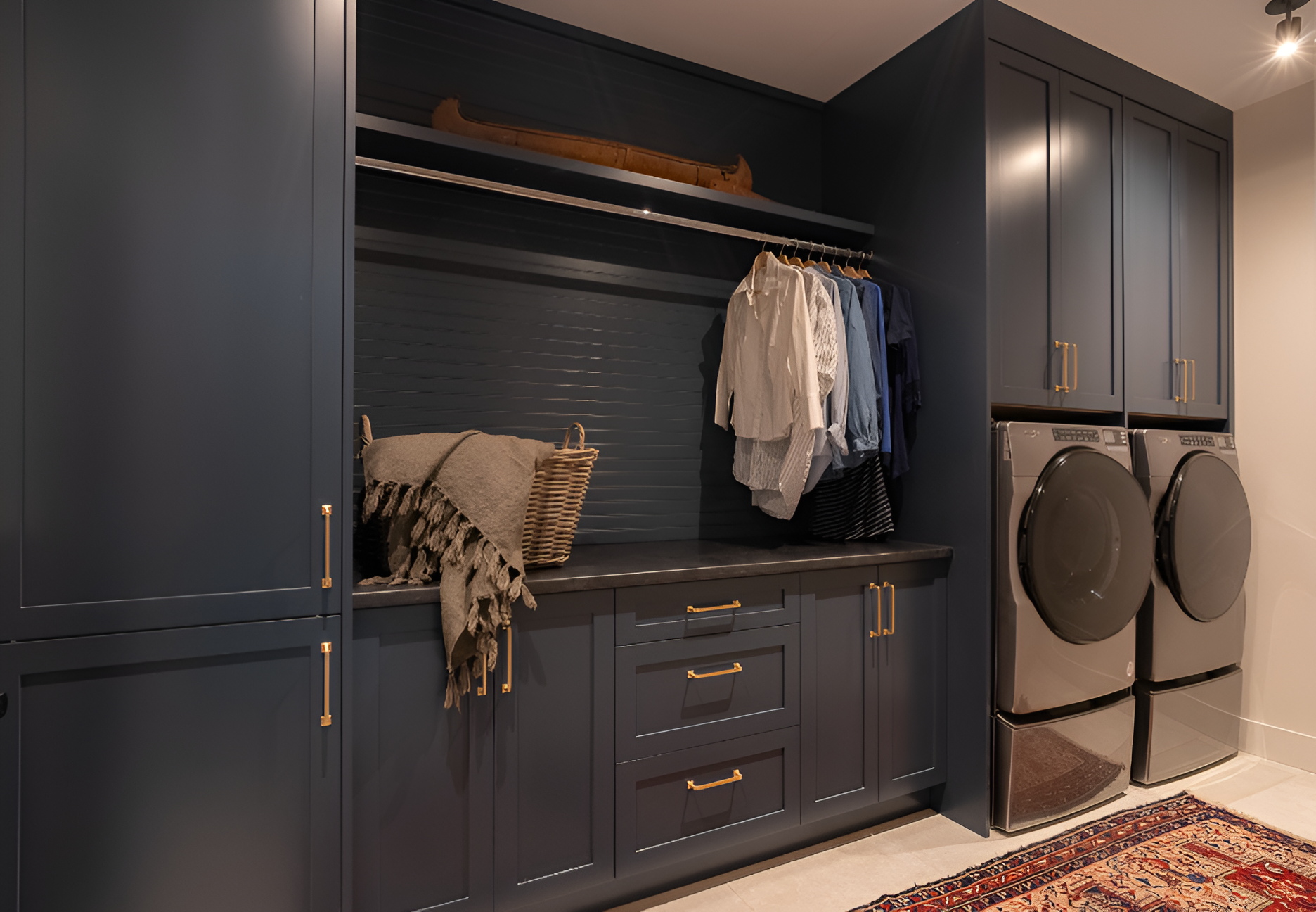 A dark moody colour in this Balsam Lake laundry room creates drama and depth in an otherwise utility driven room.